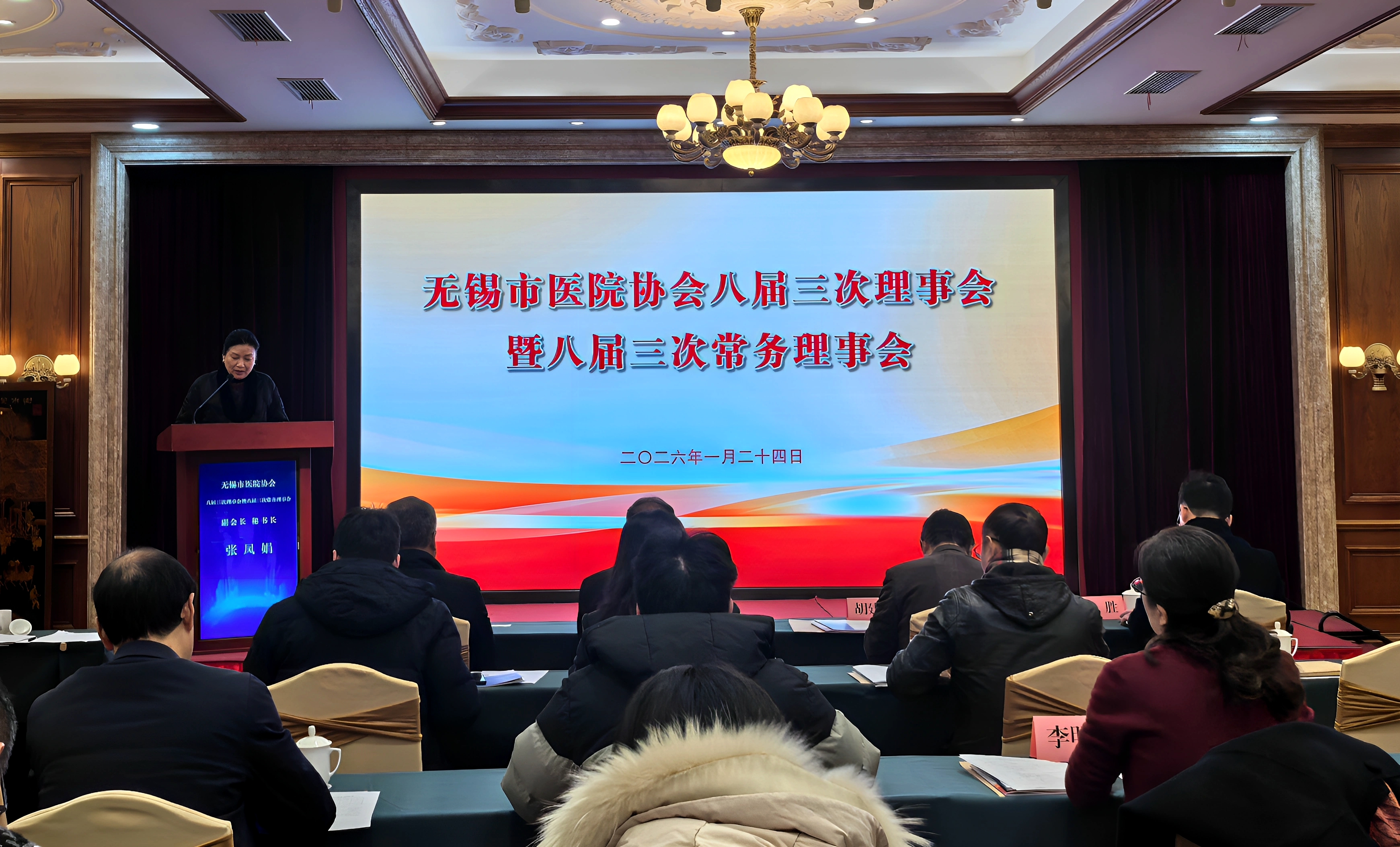2026年1月24日上午,无锡市医院协会八届三次理事会暨八届三次常务理事会在无锡市山明水秀大饭店顺利召开。协会会长胡建伟、党支部书记杨如年,第八届理事会监事吴兵、徐青以及全体理事出席会议。